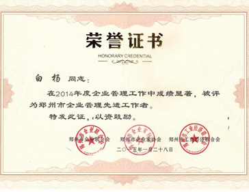 熱烈祝賀我公司白楊同志獲得鄭州市企業(yè)管理先進(jìn)工作者稱號