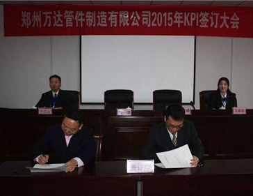 2016/01/28 412 鄭州萬達(dá)管件制造有限公司2015年KPI簽訂會于1月30號在公司行政區(qū)會議室隆重舉行,公司班長以上所有管理人員參加了此次簽訂會議。簽訂會分為三級簽訂,即:董事長與總經(jīng)理簽訂、總經(jīng)理與公司各高管簽訂、公司各高管與分管的各部門負(fù)責(zé)人簽訂,近期,各部門負(fù)責(zé)人將部門的KPI指標(biāo)進(jìn)行分解,與各班組及相關(guān)崗位簽訂目標(biāo)責(zé)任書,達(dá)到千...