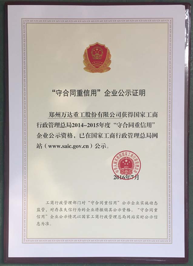 熱烈祝賀鄭州萬(wàn)達(dá)重工股份有限公司榮獲2014-2015年度“國(guó)家守合同重信用”企業(yè)