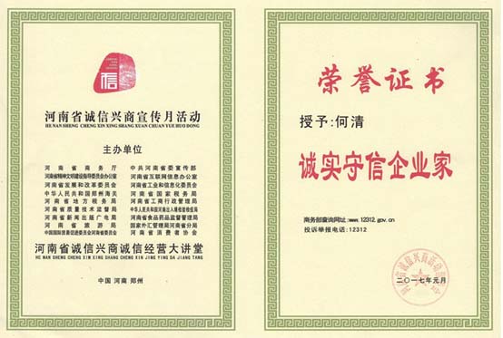 熱烈祝賀鄭州萬(wàn)達(dá)重工股份有限公司及公司董事長(zhǎng)、書(shū)記何清先生獲的“誠(chéng)信興商雙優(yōu)示范單