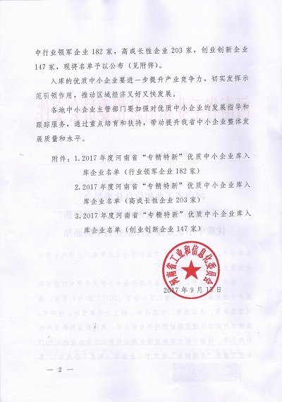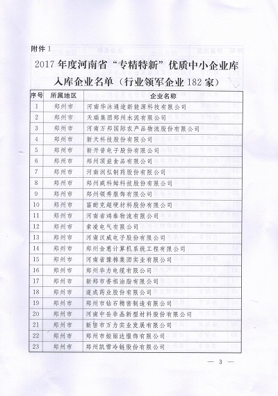 按照《河南省工業(yè)和信息化委員會(huì)辦公室關(guān)于建立河南省優(yōu)質(zhì)中小企業(yè)庫(kù)的通知》(豫工信辦企業(yè)【2017】20號(hào))的要求,經(jīng)過自愿申報(bào)、逐級(jí)推薦、專家評(píng)審、網(wǎng)上公示等程序,鄭州萬達(dá)重工股份有限公司成果入選河南省“專精特新”優(yōu)質(zhì)中小企業(yè)庫(kù),被認(rèn)定為行業(yè)領(lǐng)軍企業(yè)。