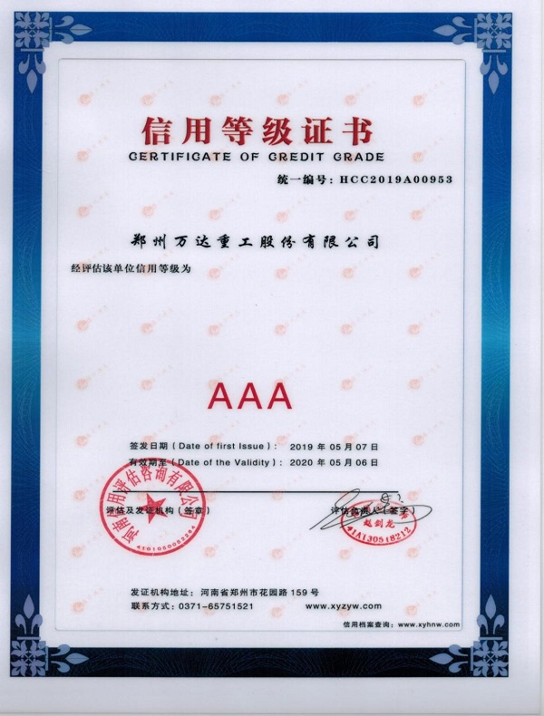 2019年5月7日,河南信用評估咨詢有限公司簽發(fā)AAA主體信用等級證書授予鄭州萬達重工股份有限公司。在2019年的AAA主體信用評級中,鄭州萬達重工股份有限公司順利通過復審,榮獲AAA信用等級證書,保持了連續(xù)多年的AAA信用等級。