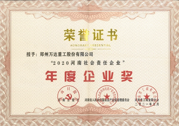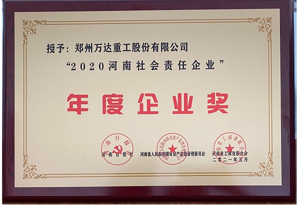 熱烈祝賀鄭州萬達重工股份有限公司榮獲“2020河南社會責(zé)任企業(yè)”年度企業(yè)獎