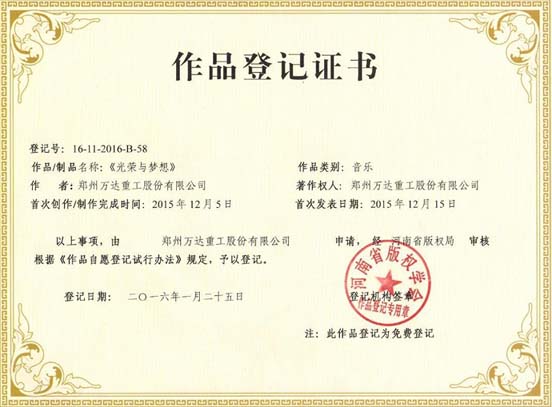 2016/03/04 404 熱烈祝賀鄭州萬達(dá)重工股份有限公司司歌《光榮與夢想》通過河南省版權(quán)局審核,并榮獲河南省版權(quán)局版權(quán)證書。